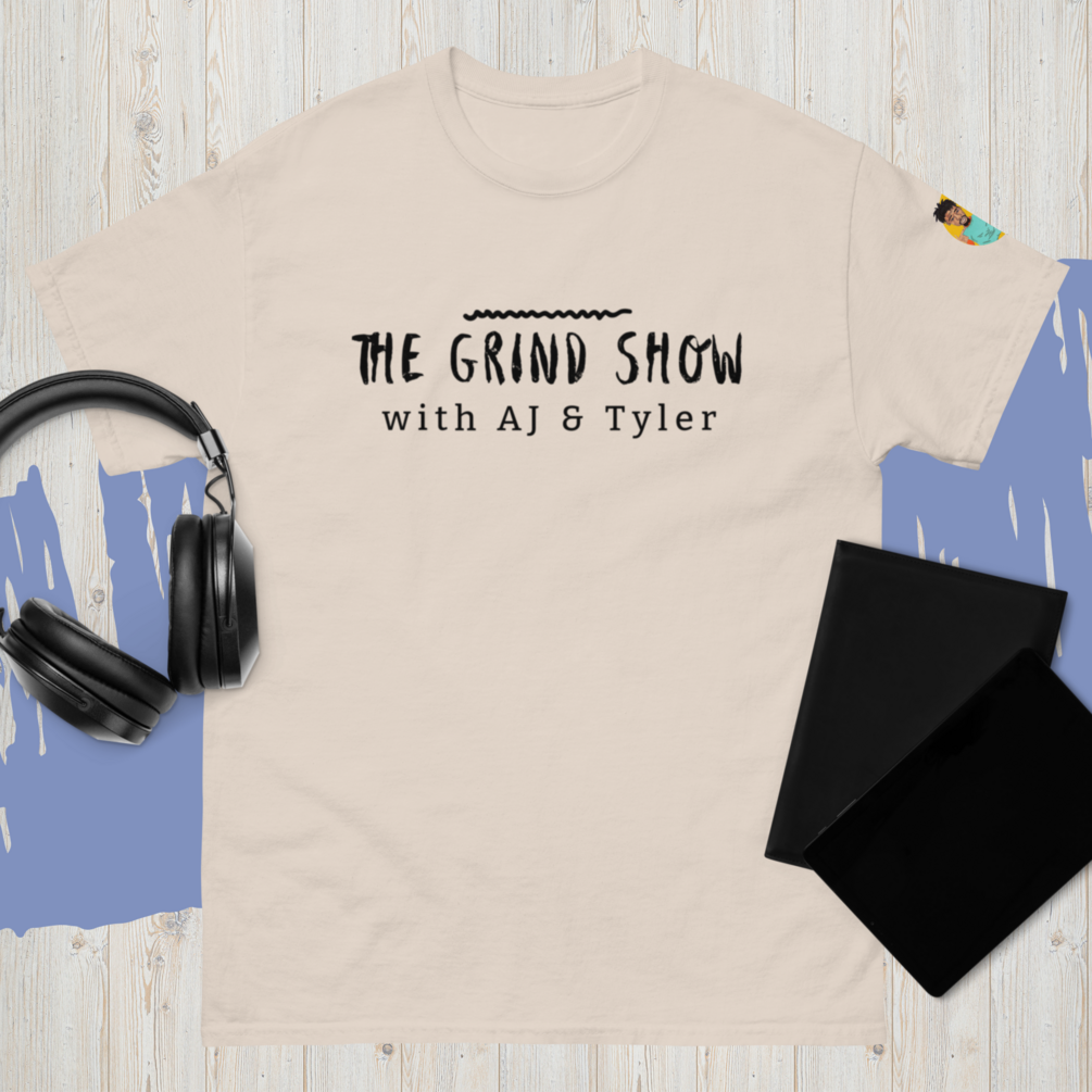 The original custom tee design for "The Grind Show with AJ & Tyler."
